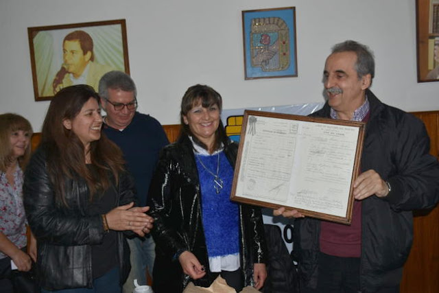 Antes de compartir un Almuerzo con la militancia en la mencionada sede partidaria , recibió como  obsequio un cuadro con la réplica de la Partida de Nacimiento del General Juan Domingo Perón, de manos de las mencionadas Norma Ali y Mara Pérez .