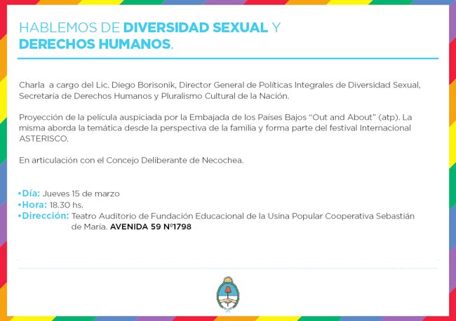 Debido al interés presentado por la temática de Diversidad Sexual proponemos programar una serie de actividades para el año en curso, dando inicio con la proyección de la película auspiciada por la Embajada de los Países Bajos “Out and About”. La misma aborda la temática desde la perspectiva de la familia, apta para todo público. Siendo una gran oportunidad para que asistan autoridades y agentes municipales, asociaciones civiles, Consejo Escolar, organizaciones LGBTIQ  , Colegios de profesionales , Fuerzas de seguridad etc. y toda la comunidad, para reflexionar en base a ella.