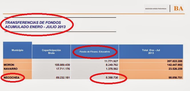 Que la transferencia de fondos acumulados a la Municipalidad de Necochea correspondientes al período enero – julio de 2013, sobre el Fondo de Financiamiento Educativo, según datos de Subsecretaría de Coordinación Económica dependiente del Ministerio de Economía de la Provincia arroja una cifra de $ 5.388.736.