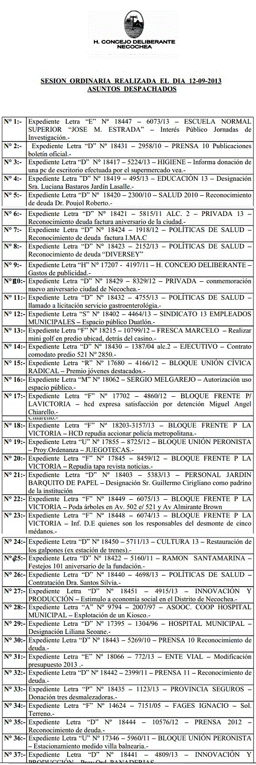 Este jueves 12 de agosto se realizará una nueva Sesión Ordinaria del Honorable Concejo Deliberante a partir de las 19hs. Según consta en el orden del día, hay 37 asuntos para ser tratados aunque la mayoría de ellos sobre temas menores, tales el reconocimiento de deudas a exfuncionarios, empresas y proveedores publicitarios de la municipalidad. Pero lo más sustancioso ocurrirá con los proyectos sobre tablas: