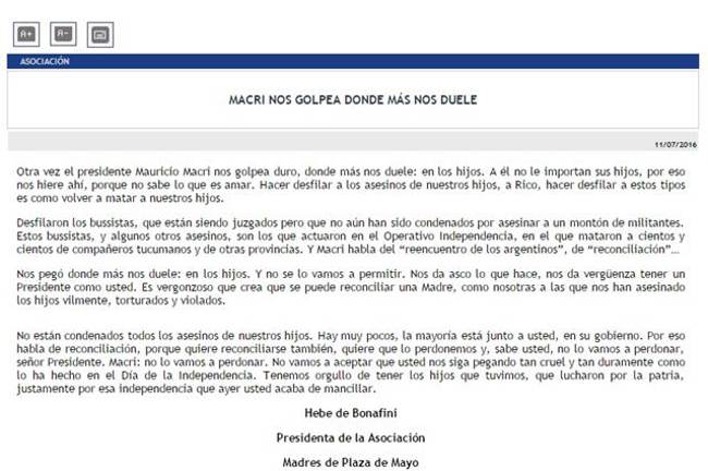 En un mensaje publicado en el sitio web de las Madres de Plaza de Mayo, Bonafini le recordó al Presidente que «no están condenados todos los asesinos» que participaron de la última dictadura cívico militar y agregó: «La mayoría está junto a usted, en su gobierno».