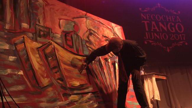 El plástico local pintó en pleno escenario un mural con aroma tanguero y con identidad local, al mismo tiempo que Raúl Lavié ofrecía su impactante show. “Me convocó Eduardo Otero (presidente del ENTUR) y la verdad que no lo dudé para nada porque para mi es un honor participar de esta ruta que está haciendo las cosas muy bien”, aseveró el artista. La muestra será subastada por la Cooperadora del hospital