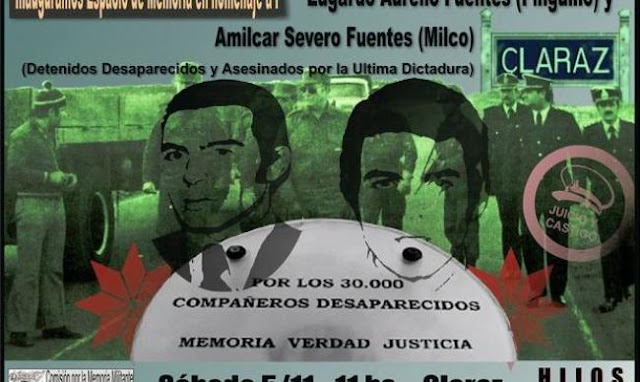 La actividad se llevará a cabo el 5 de noviembre para recordar a “Milco” y el “pingüino”, el primero de ellos secuestrado en Claraz, con complicidad civil y policial local, y el segundo detenido y desaparecido posteriormente tras ser llevado del departamento de unos amigos en la Ciudad de la Plata.
