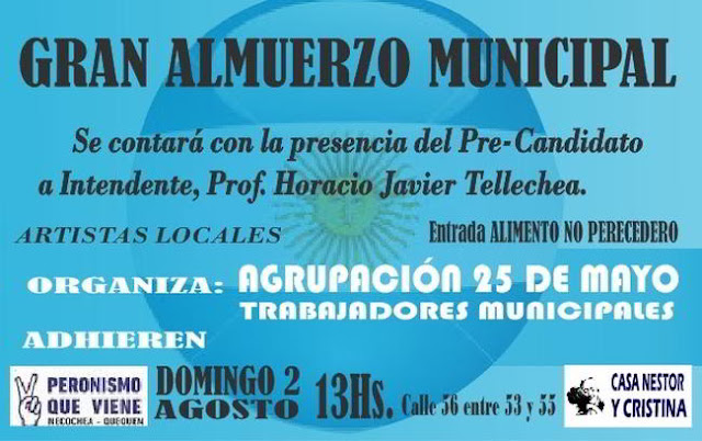 Con la presencia del Candidato a Intendente del Distrito por el FPV Lista 4 , Profesor Horacio Javier TELLECHEA, trabajadores municipales de Necochea y Quequén, nucleados en torno a la Agrupación 25 de Mayo , realizarán el día DOMINGO 2 DE AGOSTO A LAS 13 HS UN ALMUERZO en calle 56 entre 53 y 55 , oportunidad en la que podrán escuchar las principales propuestas del futuro Jefe de gobierno Municipal, asi como transmitir las inquietudes y los problemas, que padecen los trabajadores en su lugar de trabajo.