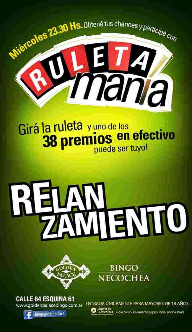 El día miércoles 15 de abril a partir de las 23.30 hs, Bingo Golden Palace relanza la promo “Ruletamanía” que ofrece la posibilidad de ganar más de $ 1.500 premios en efectivo.
