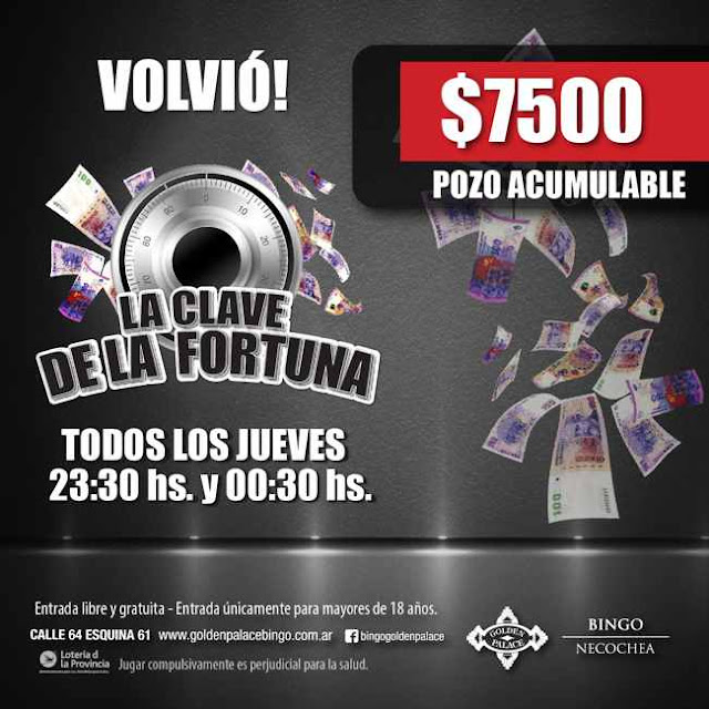 HOY, jueves 21 de abril desde las 23.30hs, Bingo Golden Palace continuara con la renovada promoción denominada “La Clave de la Fortuna” donde se pondrán en juego más de $7.500 en efectivo, en 2 sorteos modalidad “sale o sale” durante el transcurso de la noche.