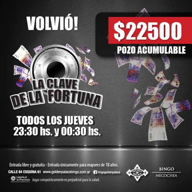 HOY, jueves 02 de junio desde las 23.30hs, Bingo Golden Palace continuara con la renovada promoción denominada “La Clave de la Fortuna” donde se pondrán en juego más de $22.500 en efectivo, en 2 sorteos modalidad “sale o sale” durante el transcurso de la noche.