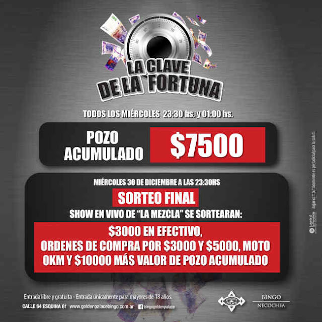 Hoy, miércoles 23 de diciembre desde las 23.30hs, Bingo Golden Palace realizará la anteúltima noche de la promoción “La Clave de la Fortuna” donde se pondrán en juego más de $7.500 en efectivo, en 4 sorteos modalidad “sale o sale” durante el transcurso de la noche.