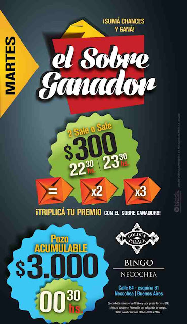Previo al sorteo del pozo acumulado, a partir de las 22.30 hs se extraerán 2 cupones con modalidad sale o sale de $ 300 en efectivo, otorgando la posibilidad de “duplicar” o “triplicar” el valor del premio obtenido en dicho sorteo, a través de la elección de El sobre ganador. Los interesados que quieran participar en las Promos y Sorteos Especiales, lo pueden hacer adquiriendo las chances en las salas de Bingo Golden Palace.