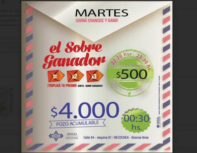 Necochea, 31 de Mayo de 2016.- HOY, martes 31 de mayo a partir de las 22.30hs, Bingo Golden Palace llevara a cabo una nueva noche de sorteos de la promoción “El Sobre Ganador 2016” donde se pondrán en juego más de $7.000 en efectivo, entre sorteos modalidad “sale o sale” y “acumulable”.