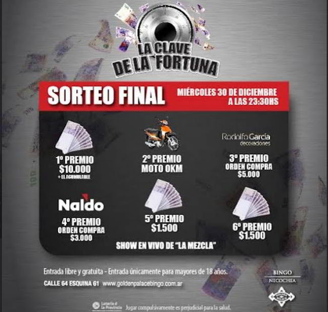 Necochea, 30 de Diciembre de 2015.- HOY, miércoles 30 de diciembre desde las 23.30hs, Bingo Golden Palace realizara el sorteo final de la promoción “La Clave de la Fortuna” donde se pondrán en juego más de $20.000 en efectivo e importantes premios, todos los sorteos se realizaran bajo la modalidad “sale o sale”, además esta velada especial contara con la actuación especial de “La Mezcla”, banda originaria de la ciudad de Lobería, que hará bailar y disfrutar a los presentes.