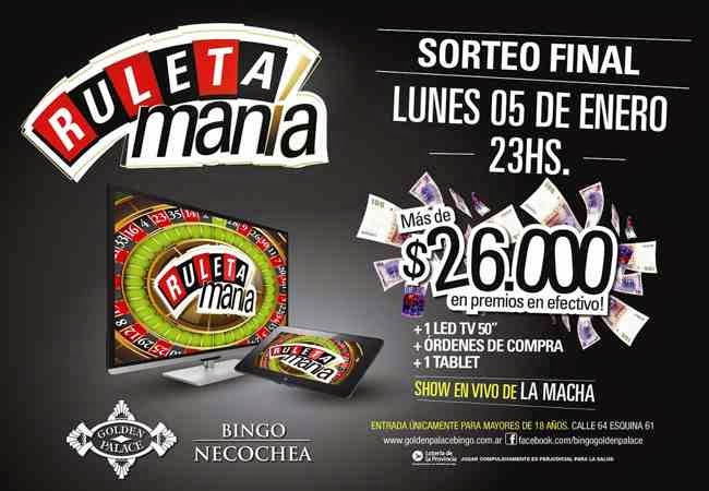Este Lunes en Bingo Golden Palace, ubicado en calle 61 esquina 64 de Necochea, el público puede disfrutar del gran cierre de la Promo “Ruletamanía”, por importantes premios, con entrada general sin cargo para mayores de 18 años.