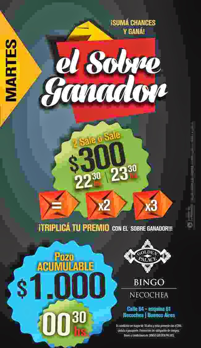 Los Martes en Bingo Golden Palace ubicado en calle 61 esquina 64 de Necochea, el público puede disfrutar de una variedad de promociones especiales y premios acumulados, con entrada general sin cargo para mayores de 18 años.