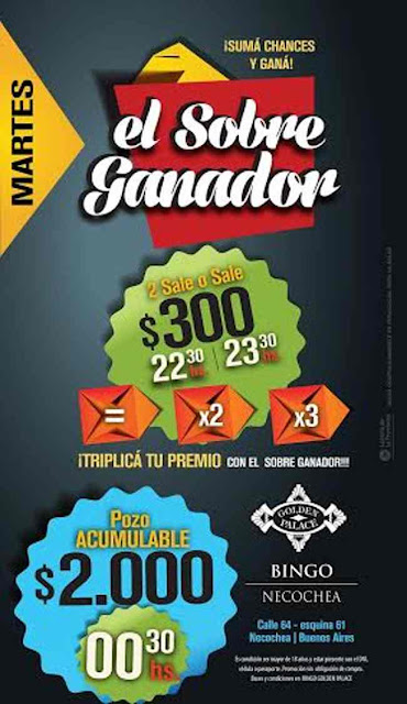 Los Martes en Bingo Golden Palace ubicado en calle 61 esquina 64 de Necochea, el público puede disfrutar de una variedad de promociones especiales y premios acumulados, con entrada general sin cargo para mayores de 18 años.