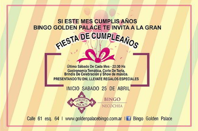 Necochea, viernes 24 de julio de 2015.- MAÑANA, sábado 25 de julio a partir de las 22:30 hs, Bingo Golden Palace despide el mes con un gran festejo de “Fiesta de Cumpleaños”.