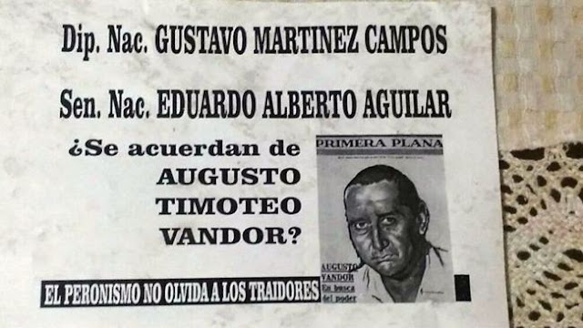 Un cartel amenazante generó preocupación en las últimas horas en Resistencia. La capital chaqueña amaneció empapelada con afiches que rezaban «El peronismo no olvida a los traidores», junto a los nombres del diputado Gustavo Martínez Campos y el senador Eduardo Aguilar y la frase «¿Se acuerdan de Augusto Timoteo Vandor?». También aparece la tapa de una vieja revista Primera Plana, con el retrato del «Lobo», asesinado en 1969.