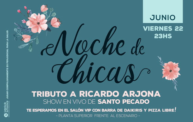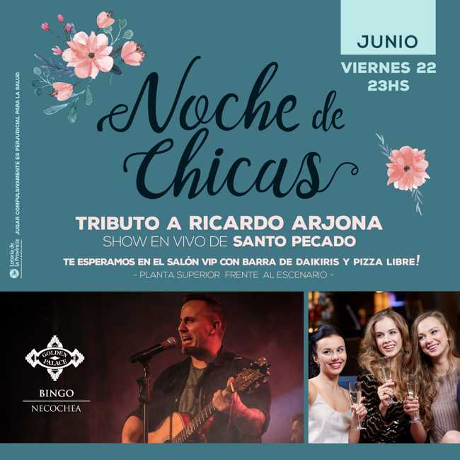 Hoy, a partir de las 23hs, llega “Noche de chicas” a Bingo Golden Palace y tenemos listos todos los detalles para que esta noche pensada para vos y tus amigas sea única! Te presentamos otro gran show en vivo en nuestro escenario: “Santo Pecado”, el consagrado tributo a Ricardo Arjona.