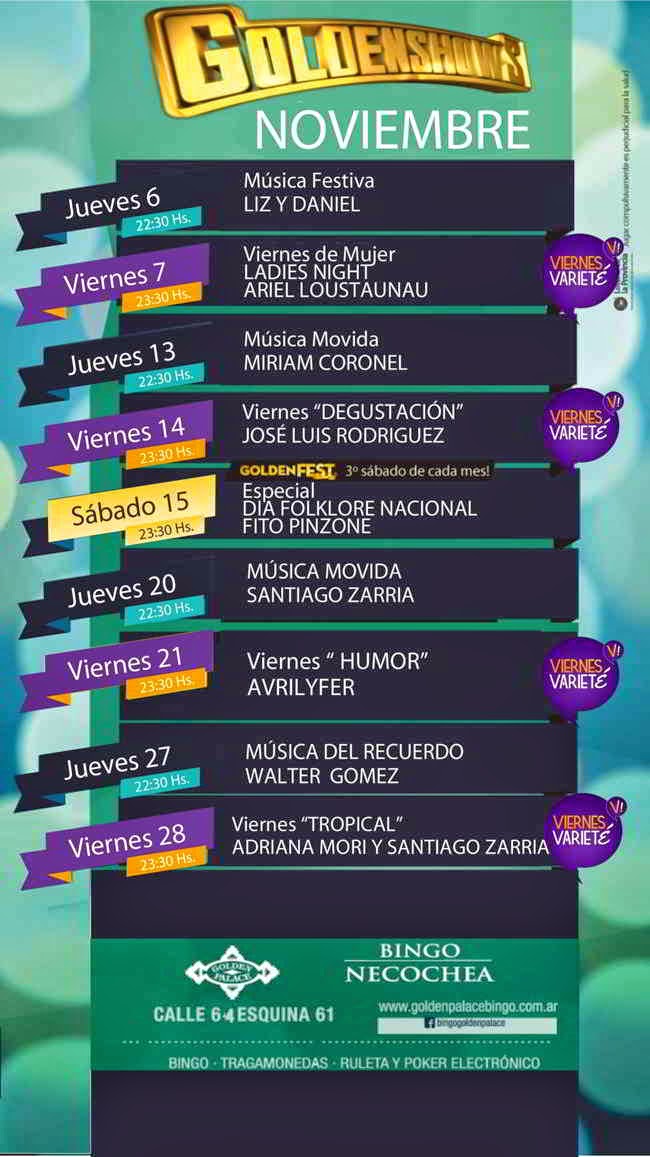 Dentro del marco de los GoldenShows, todos los jueves a partir de las 22:30 horas en calle 61 esquina 64 de Necochea, el público puede disfrutar de una variedad de espectáculos musicales, con entrada general sin cargo para mayores de 18 años.