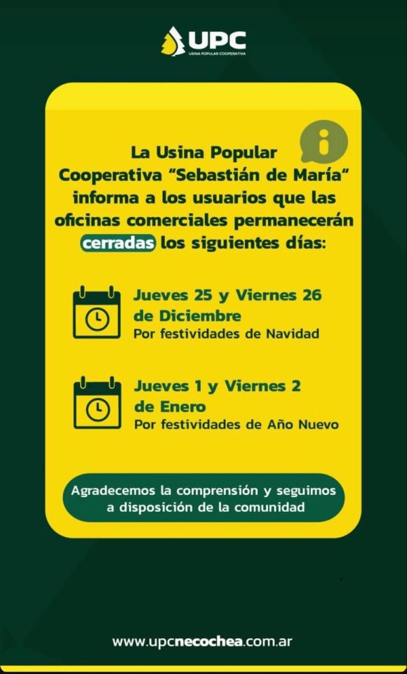 La Usina Popular Cooperativa Sebastián de María informó que las oficinas comerciales permanecerán cerradas en fechas puntuales con motivo de las celebraciones de fin de año.