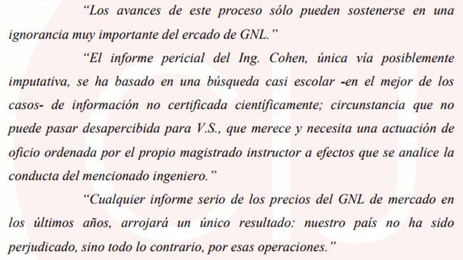 Cohen fue denunciado penalmente por Walter Fagyas, ex presidente de Enarsa. El Dr. Alfredo Huber fue el encargado de presentar un minucioso escrito del que se desprenden tres puntos claves de la pericia que dejan al descubierto que el informe carece de sustentabilidad técnica: