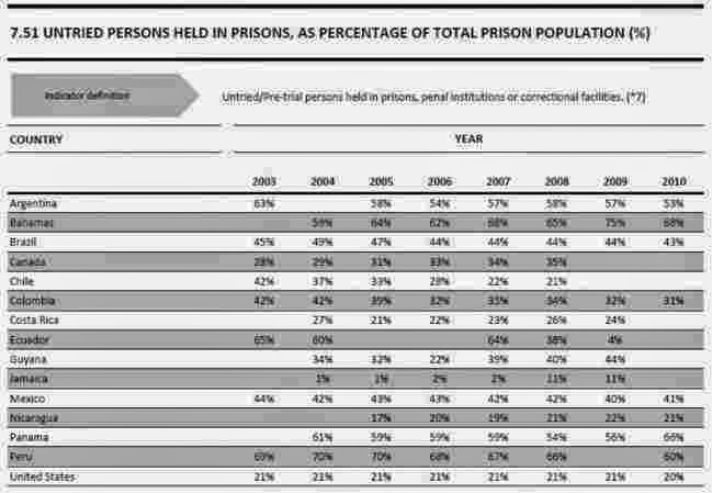Los datos sobre personas detenidas sin condena, como porcentaje del total de la población carcelaria, son, por país: