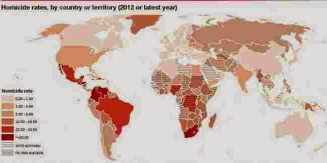 Para tener un panorama más global, veamos este mapa que grafica con la intensidad del color rojo las diferentes tasas de homicidios en todo el mundo (más oscuro significa más inseguro):