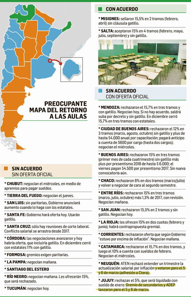 Las ofertas parten de una base del 5% (Jujuy). Ante la falta de entendimiento, ya votaron paros ATEN en Neuquén y ADEP y el gremio de los secundarios en Jujuy.
