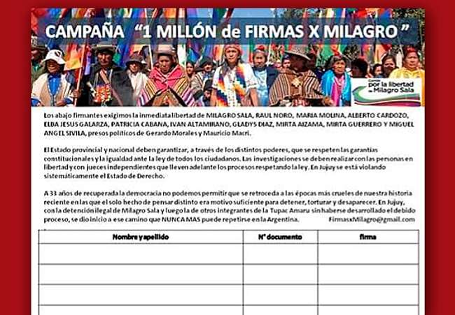 El Comité por la Libertad de Milagro Sala lanzó una campaña de recolección de firmas para exigir al Estado provincial y al nacional el cese de detención de la dirigente social y los otros 10 presos en el marco de las investigaciones que impulsa el gobierno de Gerardo Morales.