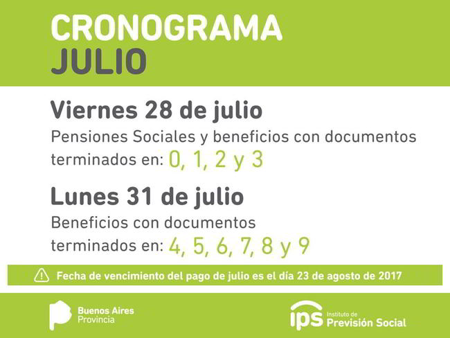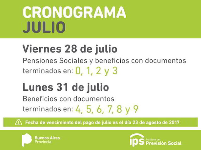 El Instituto de Previsión Social (IPS) informa que a partir del próximo viernes 28 comenzarán a abonarse los haberes correspondientes al mes de julio para Jubilados y Pensionados de la Provincia de Buenos Aires.