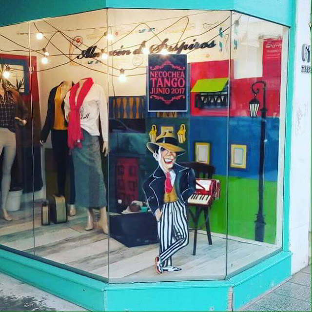 Los comerciantes participan también de la Ruta del Tango, y han vestido sus respectivos locales con decoración alusiva dentro del concurso de vidrieras que organiza el Ente Necochea de Turismo (ENTUR)