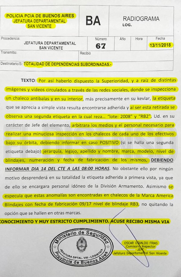 Al viralizarse este material, inmediatamente la Jefatura Departamental, dio la orden de inspeccionar los chalecos oportunamente entregados desde la gobernación, a fin de detectar otras unidades con etiquetas alteradas. La circular oficial que fuera remitida a la totalidad de las dependencias, detalla que “se especula que estas anomalías son encontradas en chalecos de la marca America Blindajes con fecha de fabricación 9/17 nivel de blindaje RB3“.