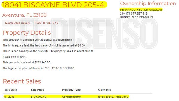 Andújar, a la fecha se encuentra notado en AFIP como trabajador autónomo Categoria T1 Cat III con Ingresos hasta $15.000 pero en Miami alguien con su mismo nombre figura como reciente comprador de un piso de lujo en “Del Prado Condo” por u$s 300.000. Ubicado en el 18041 Biscayne Boulevard, los datos de la compra de la unidad 205-4 se encuentran en el libro 30242, página 3169 y se pueden consultar online.