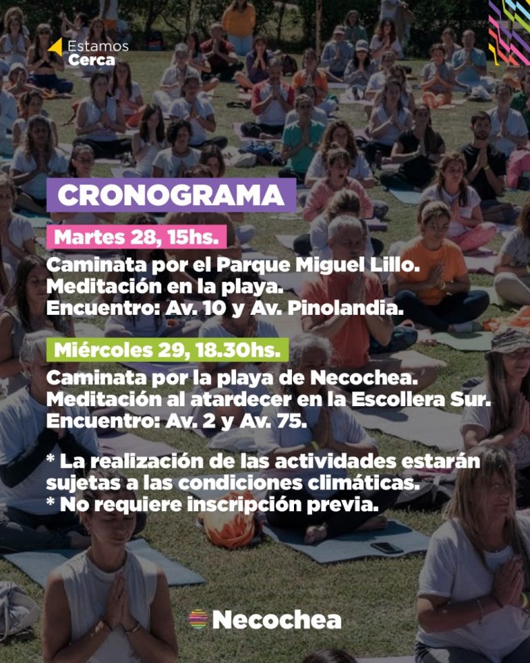 La Secretaría de Turismo y Desarrollo Productivo municipal invita a la comunidad a sumarse a las actividades gratuitas programadas por la Escuela de Natha Yoga Central de Necochea en el marco del “XXI Retiro Internacional de Yoga y Meditación”. La asistencia no requiere inscripción previa pero está supeditada a las condiciones climáticas.