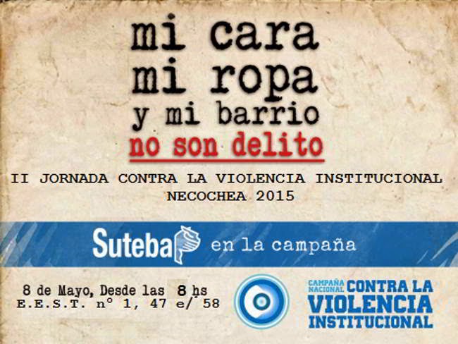 Este viernes 8 de mayo, día “Nacional de la Lucha Contra la Violencia Institucional” el SUTEBA Necochea organiza la II JORNADA JORNADA CONTRA LA VIOLENCIA INSTITUCIONAL. Dicha jornada, que se desarrollará a partir de las 8.00 hs hasta las 16.00 hs. en las instalaciones de la EEST nº 1 , sita en calle 47 entre 58 y 60, contará con la participación de unos 300 jóvenes representantes de todas las escuelas secundarias y terciarias del distrito acompañados por sus docentes.