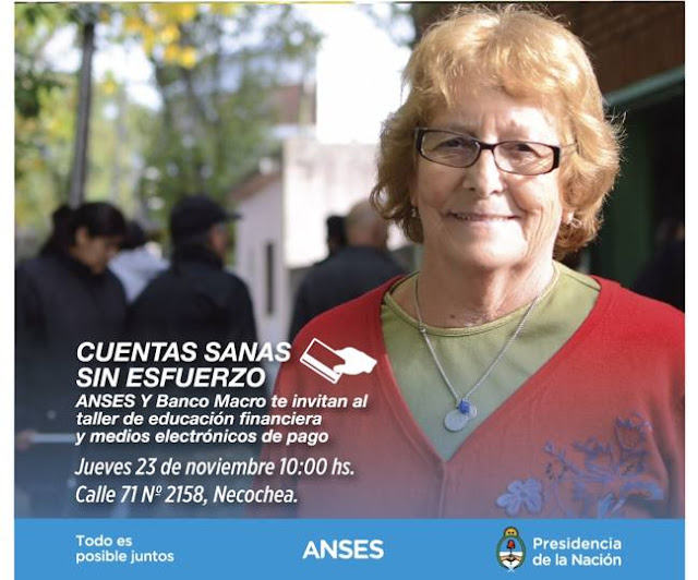 La ANSES y el Banco Macro dictarán, el próximo jueves 23 de Noviembre, una capacitación en el uso de canales electrónicos destinada a adultos mayores. Será en dos encuentros: el primero a las 10 horas en el Centro de Jubilados “Barrio Sur”, ubicado en Calle 71 N° 2158, de la Ciudad de Necochea.
