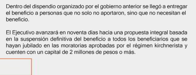 La documentación fue presentada anoche por Ezequiel Orlando en el programa El Destape que conduce Roberto Navarro. El proyecto será presentado durante este año. La idea es revisar cada una de las jubilaciones que se entregaron durante el kirchnerismo. La idea es que aquel jubilado o jubilada que tenga una pequeña propiedad de 2 millones de pesos o más, la perderá.