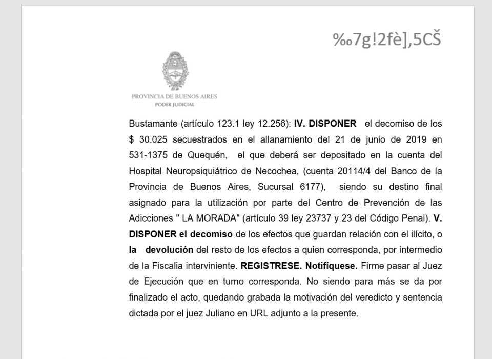 «Lo interesante, o al menos novedoso, es que se dispone que el dinero secuestrado en el allanamiento ($ 30.025) sean depositados a la orden del CPA «La Morada» para que lo puedan destinar a sus actividades relacionadas con consumos problemáticos» señaló el magistrado.