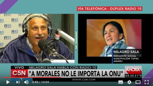 La dirigente social jujeña señaló que si Macri y Morales no cumplen lo que planteó la ONU, “se están contradiciendo”. “Muchas veces ellos dicen que hay que respetar las instituciones. Hoy ellos no están respetando instituciones, se están cagando en las instituciones”, señaló Sala en una entrevista por Radio 10 que pudo realizarse porque desde la producción del programa Secreto de Sumario se hicieron pasar por familiares de la dirigente para que desde el Servicio Penitenciario permitieran la comunicación. El reportaje finalizó abruptamente cuando los agentes penitenciarios se dieron cuenta de que estaba hablando con un medio de comunicación.