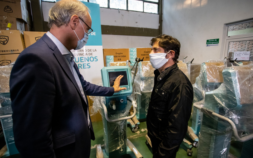 El gobernador de la provincia de Buenos Aires, Axel Kicillof, junto al ministro de Salud, Daniel Gollán, visitó el centro logístico El Dique, ubicado en el distrito de Ensenada. Allí, recibieron nuevos respiradores fabricados por una compañía de José C. Paz.