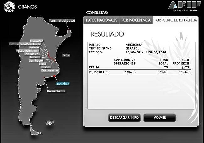 La Afip puso anoche a disposición de todo el mundo un lugar en su web, en el cual se pueden consultar los precios de las liquidaciones primarias (productor a acopiador) que procesa en forma diaria, el cual se puede filtrar por fecha, por producto y por puerto.