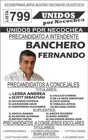 Por problemas ajenos a nuestro partido político, las boletas para las próximas elecciones PASO a celebrarse el Domingo 9 de Agosto, no serán de color violeta como fuese anunciado, por una diferencia en el tono de impresión en las boletas presentadas ante la Cámara Electoral, las boletas de UNIDOS POR NECOCHEA – LISTA 799 que lleva como precandidato a intendente a Fernando Banchero serán BLANCAS Y NEGRAS.