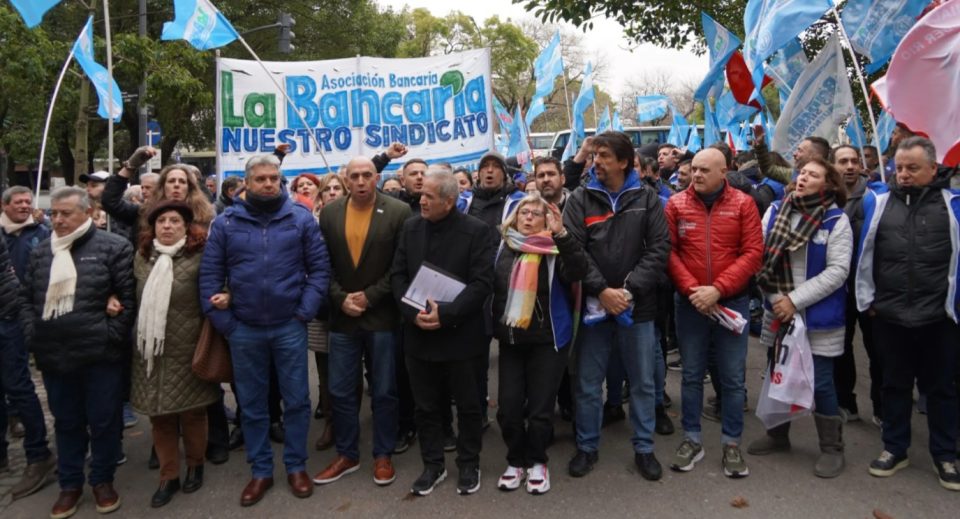 Con una manifestación masiva frente a la sede diplomática española, el sindicato liderado por Sergio Palazzo expuso las prácticas abusivas del Santander y exigió la intervención del gobierno español. El gremio anticipó que podría profundizar su plan de lucha si no hay respuestas.