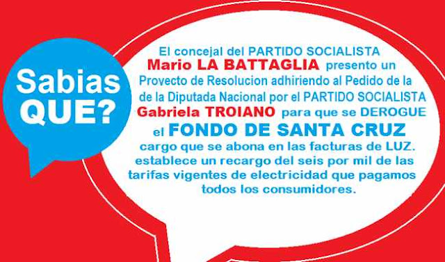 Es por ello que el Concejal del Partido Socialista MARIO LA BATTAGLIA presento un proyecto de resolucion adhiriendo al pedido de la Diputada Nacional del Partido Socialista Gabriela Troiano para que se derogue el FONDO DE SANTA CRUZ.