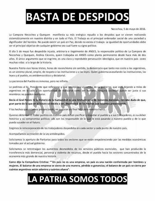 La Campora Necochea y Quequen manifiesta su más enérgico repudio a los despidos que se vienen realizando sistemáticamente en nuestro distrito y en todo el País. El Trabajo es el principal ordenador social de una sociedad y dignificador del hombre. No puede existir un país en Paz, donde no exista el trabajo. La igualdad de oportunidades debe ser el principal objetivo de cualquier gobierno sea cual fuere su signo político.