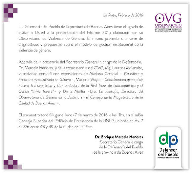 Este Lunes 7 de Marzo se llevará adelante la presentación del informe «Monitoreo de Políticas Públicas y Violencia de Género», a cargo del Observatorio de Violencia de Género de la Defensoría del Pueblo de la Provincia de Buenos Aires.