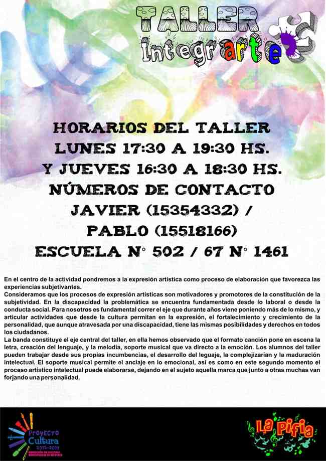 A modo de información, el taller de Integrarte funcionará dos días a la semana, lunes de 17.30 a 19.30 Hs. y jueves de 16.30 a 18.30 Hs., de manera provisoria en la Escuela Nº 502, en calle 67 al 1461, hasta que quede apto el espacio en la Escuela de Arte Local.