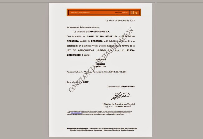 El texto de la habilitación señala que » La empresa SHIPINSUARENCE S.A. con Domicilio en CALLE 71 BIS N°318, de la localidad de NECOCHEA, partido de NECOCHEA, está habilitado de acuerdo a lo establecido en el artículo 4° del Decreto Reglamentario 499/91 de la LEY DE AGROQUÍMICOS 10.699/88, por Exp. N° 22500-22162/2013-0, como: Aplicadora URBANA EN SILOS. Personal Aplicador Afectado: Fernando N. Cañada DNI: 22.475.386. Bajo el número: 2387. Vencimiento: 30/06/2014. Director de Fiscalización Vegetal: Ing. Agr. Luis María Herrera».