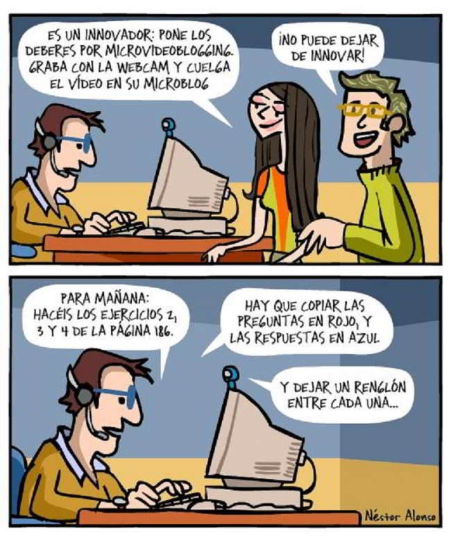 Respecto a esto último, los profesores deben ser capacitados para afrontar los nuevos desafíos que, como esgrime el Filósofo francés, Gilles Deleuze (1995), supone un nuevo paradigma: el del mercado mundial de la economía y la globalidad de la información, ese que aporta respuestas inmediatas a los niños (alcanza con un click) y los transforma en alumnos que, como se escucha frecuentemente, “ya no son como los de antes”. Es indudable que los docentes debemos hablar el mismo “lenguaje” que nuestros estudiantes: el de la tecnología, pero también es indudable que de nada servirá si nos apegamos a los formatos tradicionales y solo los disfrazamos detrás de una pantalla para convertirlos en un “eufemismo digital”.