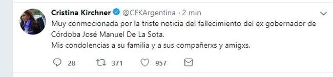 La ex presidenta Cristina Kirchner fue de las primeras en manifestar públicamente su dolor por la muerte de De la Sota: