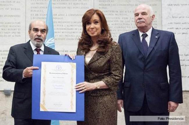 La FAO premió a la Argentina por cumplir uno de los Objetivos del Milenio, que tenía como meta la reducción del hambre a la mitad. El reconocimiento es por el rol que ha desarrollado en políticas públicas para combatir el hambre. La Presidenta Cristina Fernández de Kirchner recibió el premio como máxima representante del gobierno argentino.